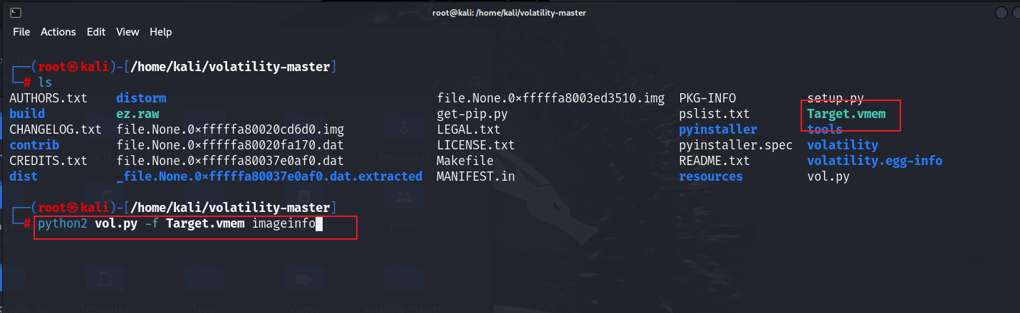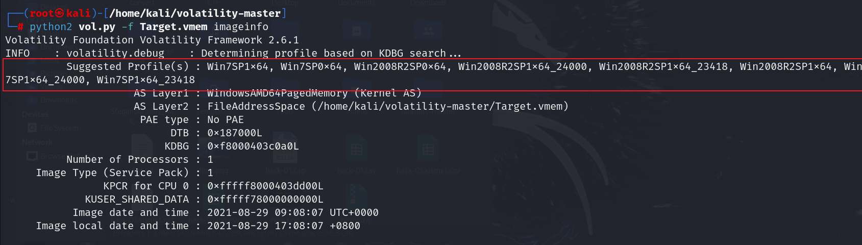 来查看Target.vmem文件的镜像信息,这里的-f 指的是 file ,用于指定文件,imageinfo是查看镜像文件的信息,imageinfo在内存取证中一般都是经常使用的