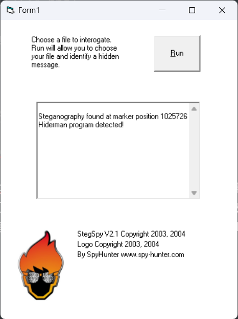 StegSpy是一款著名的检测隐藏信息的签名分析软件,为什么它可以分析,是因为很多隐写程序都有一个共同特性,就是它们还会在文件中嵌入它们自己的唯一标识,比如Hiderman,会在载体文件的尾部追加“CDN”这三个ASCII码。于是可以创建一个签名库,搜集市面上大多数隐写软件的唯一标识,即可进行隐写分析。