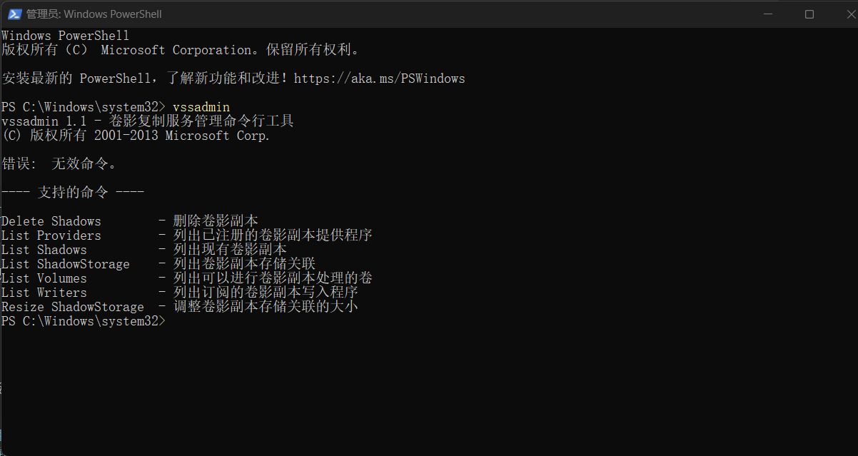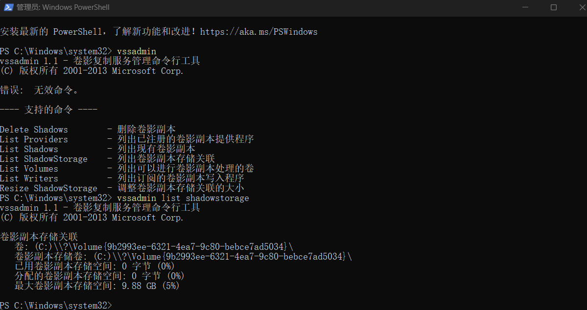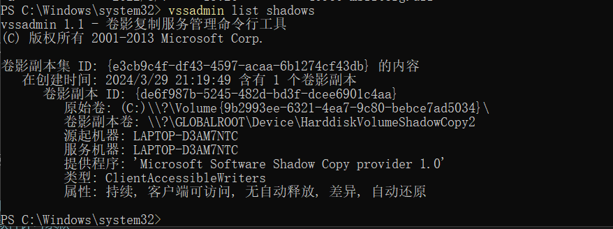 在windows7以上系统中,管理员用户可以在命令行用VSSadmin来管理卷影副本: